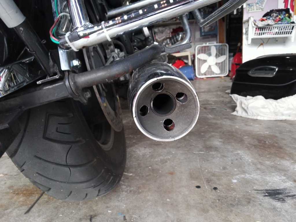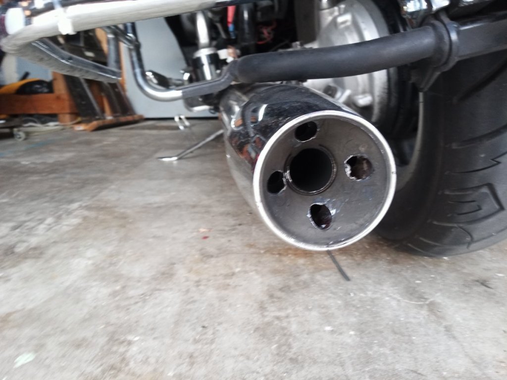 Have a local friend with an 09 (i think) maroon venture his pipes had 4 1/2 holes in the rear of the pipes. he thought it was stock until he saw mine. We drilled mine this morning the sound is great, not as load as a Harley but loader than stock Yamaha pipes. You have to start the outer hole at an upwards angle drill it thru and then go to 90 degree and drill thru the second flange