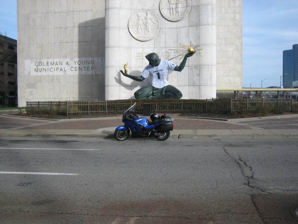 Let's get some facts straight , we decided on the name Bad boy for the RSTD it's not a RSV. some eye doctor may be needed. yes it's black. Pam will only ride on the Bad Boy as my other bike is a Connie (Kawasaki concours) Blue in color which I traded the sportster I won for it. So when I get a chance to go by myself I'll ride Connie ( ) . I ended up in Detroit on my little ride ( turned into 70 miles ) on Christmas Day and the big guy is wearing a Michigan State Jersey I thought would be proof of the ride. Could have turn around and took a picture of the tunnel to Canada but that would have only confused someone. On my ride never did see an Ice cream place open. We did have footlong hot dogs Thursday for dinner. and the season for riding may not be over yet for some of us..