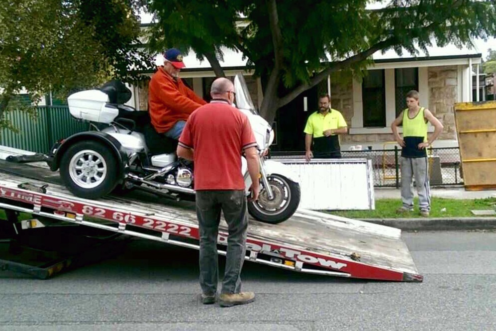 Just letting you all know that we arrived in Adelaide a week ago and are slowly unpacking and settling in. Love my new 10 metres X 6 metres workshop. Caravan in one end, bike in the middle and workshop at the other end. Needed a tilt tray tow-truck to unload the bike. Wouldn't clear the top of the ramps. Damn! Hate that.