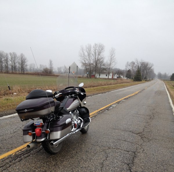 Mid 40's in southeastern MI today, so around noon I took off for a ride. I had been wanting to get some saddle time in on the new-to-me pillow top seats and put the rebuilt fuel pump through an extended test ride. Heck, those are just excuses.....I just wanted to ride. After the first 15 or 20 minutes, I pulled over in Marine City to check the fuel pump leaking gas and all was good. So, like a good VR always should, I snapped a pic of the bike. Notice the grey sky and the dampness of the concrete. The roads were a bit damp in places, dry in others. I continued on along M-29 through St. Clair and north toward Marysville. From there I went through places such as Smiths Creek, Wadhams, Goodells, and Memphis, as I made my way to Capac. I went up into town to see what was going on and turned back toward home, stopping for gas having gone 100.2 miles so far. Away from the towns, I had the roads mostly to myself. You know, time to stop in the middle of the road for a photo op. I backtracked only as far as Memphis and from there went toward Richmond so I could take a different way home. Cuz you aren't supposed to do much backtracking! From there I zig-zagged to and fro on two lane roads to extend the miles rather than head home on a direct path. I ended up on M-29 again, but almost 20 miles south of home base. I was riding along Lake St Clair, and the late afternoon sun had finally made a brief appearance, so I pulled over for another pic. By the time I got to my street, I was at 196 miles, so of course I went up the road for 2 more miles and then came back and was at 200.3 when I parked in the garage. It was a good day! I love this pic!