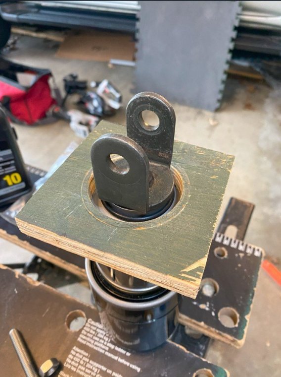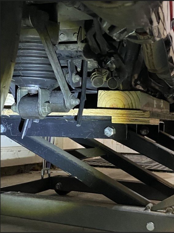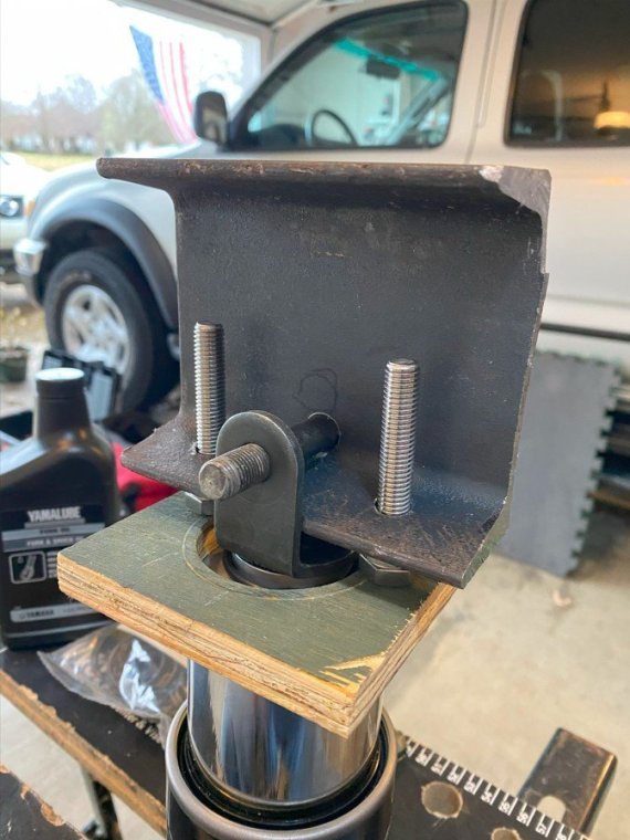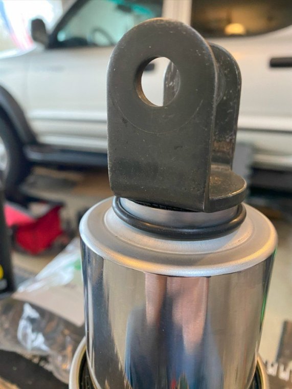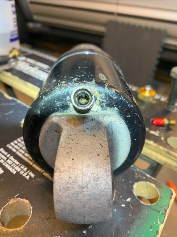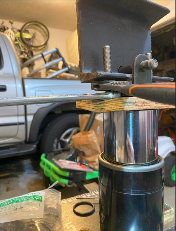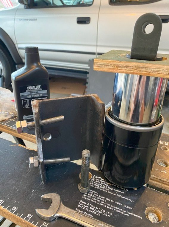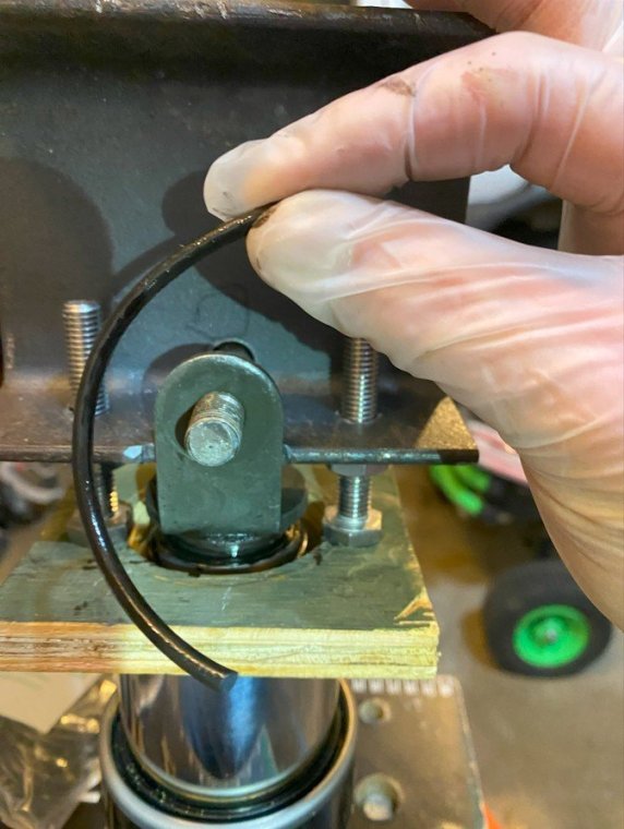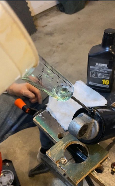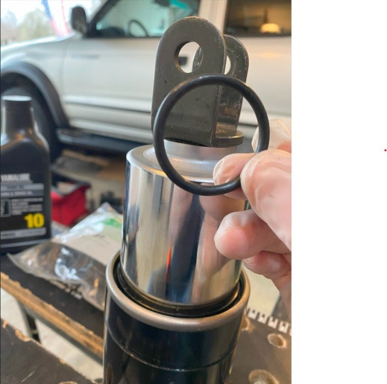 I bought my 2001 RSV with 71K Miles on it. And it had a pogo-stick rear shock. I thought I would share my adventure of renovating the rear shock on the forum. I don't see any way that this shock can be disassembled any more than what is required to replace the O ring, and Yamaha says the shock is not rebuildable. But here's the deal. There is an O ring seal on the shaft just above the bottom clevis pin shock mount that will wear out and the shock fluid will leak out. When enough fluid leaks out, your rear suspension acts like a pogo stick. Running max air pressure may help a bit, but to fix it, that O ring needs to be replaced, and shock fluid replenished, which will often restore the shock to like new performance. It fixed mine! Credit to long time member @dfitzbiz (Dave) for the detailed instructions on how to replace the O ring. I PM'd him and he quickly sent the instructions and a pic of the tool he created to accomplish the O ring replacement. I guess he has a reason for not posting those detailed instructions in an article on the forum, so I will follow his lead and not post his instructions here. I have searched and read the "RSV Repaired Rear Shock 2000 Mile Update" post from top to bottom and searched the forum site but I don't see the detailed instructions that Dave sent to me posted anywhere on this site. So I am posting pics of my shock renovation journey, along with descriptions and comments. I gotta say, after putting in the new O ring and replenishing the shock fluid, the rear shock feels like new. Dave fashioned his shock expansion tool from what looks like 1" square bar stock. I did not have ready access to this material, so I ended up using what I had on hand to build a variation of Dave's tool. As you look thru the pictures, check for descriptions and comments below the pics. Here's the O ring spec you'll need. I ordered a pack of like 50 from WalMart for about $10. Amazon, eBay etc. should have it - search for: Buna N size 218 O ring Shock Before Removal Harbor Freight Mini Moving Dolly Under Rear Wheel Harbor Freight Mini Moving Dolly Mini Dolly under rear wheel allows bike to be moved on the rolling jack after shock is removed. Removing the air filler hose from the bike. Removing the air filler. Removing the air filler. Removing the air filler. AIS is in the way - gotta come outta there. AIS coming out. Ratchet in place on top shock bolt. I think it's a 17mm. Ratchet in place on top shock bolt. Top Bolt ready to pull out. Loosening the bottom bolt. Bottom bolt ready to come out. Lowering and removing the shock. Shock removed, AIS hoses plugged and capped. Used rubber plugs for the bigger hoses (see red circle). Poor dirty old shock. Nice purty cleaned up old shock. What's behind the curtain? Removing the boot. Removing the boot. Boot removed. Boot removed. Hang the shock upside down and remove the air valve to allow shock fluid to drain. Draining the shock fluid. Draining the shock fluid. After about a day, less than 50ml drained out from the shock. After two more days, still the same. I waited that long only because I couldn't get back to this project for a couple of days, and figured it would be good to make sure it all drained out. So that's why my shock was pogo-ing. 50ml is not enough to provide damping. Maxing your air pressure to 57psi might help a bit but won't totally stop the pogo-ing. Now, if your shock won't keep air, I believe that is a separate problem. My shock would hold air pressure even tho the O ring was leaky. So my guess is there's another chamber or rubber balloon that handles the air pressure. Well, in retrospect, the above can't be right. The air goes in the same hole that you pour the shock oil into so the damping mechanism and air chamber are connected. Comments and experienced observations are welcome here! Less than 50ml of old fluid came out of my shock. Dave recommends refilling a shock with 125ml. Fabricating the expansion tool. So this piece of steel channel stock was cut from a 6 foot length I found laying in the middle of a street about 15 - 20 years ago. You never know when you might need a chunk of channel stock, right? Shock bolt will go thru this hole. Pusher bolts will go thru the two smaller holes. Lube the new O ring. Carefully slip the new O ring over the clevis and down onto the collar at the base of the shock. Carefully slip the new O ring over the clevis and down onto the collar at the base of the shock. Carefully slip the new O ring over the clevis and down onto the collar at the base of the shock. I made this pressure plate from plywood. It's not really sturdy enough for doing multiple shocks, but it worked fine for this one shock. This spreads the pressure from the pusher bolts out so as not to deform/bend the bottom of the shock housing when the pusher bolts are tightened. Expansion tool mounted and ready to pull the shaft up to expose the old O ring. Expansion tool mounted and ready to pull the shaft up to expose the old O ring. Tightening the nuts on the pusher bolts. The nuts push the tool and shaft upwards while the bolts push down against the shock body. O ring starting to show in the gap as the shock is expanded. O ring starting to show in the gap as the shock is expanded. Slip a small screwdriver under the old O ring and pull it out from the groove. Snip the old O ring and pull it out of the shock. Old O ring is clipped and ready to be pulled out. Old O ring. Clean and lube the groove that the O ring fits into. Clean and lube the groove that the O ring fits into. Use a small screwdriver to carefully coax the new O ring up off the collar and into the groove. Use a small screwdriver to carefully coax the new O ring up off the collar and into the groove. Use a small screwdriver to carefully coax the new O ring up off the collar and into the groove. New O ring in place. Clean it up as good as you can. New O ring is in place. Make sure it's still adequately lubed. Slowly back down the nuts on the pusher bolts to all